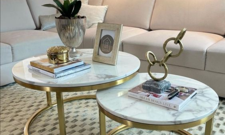 A white and gold marble coffee table is a type of coffee table that features a white or light-colored marble tabletop with a gold-toned metal or brass frame as its base. This style of coffee table is often chosen for its elegant and sophisticated appearance, and can be a great addition to a range of interior design styles. The white and gold color combination of a marble coffee table can create a striking and eye-catching focal point in a living room or family room. The white marble provides a neutral and timeless look, while the gold frame adds a touch of luxury and glamour. Marble coffee tables can come in a variety of shapes and sizes, including round, square, and rectangular. The gold frame can be simple and minimalistic, or it can feature intricate detailing or curves for a more ornate look.